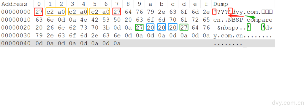 Hex视图中单引号是27(红色,绿色),三个空格(20)蓝色标出。